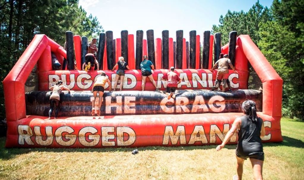 Rugged maniac is like recess for grown ups except our playground has a 3 story water slide trampolines and a fire jump and there s a huge festival right in the middle of everything with a dj and plenty of beer.